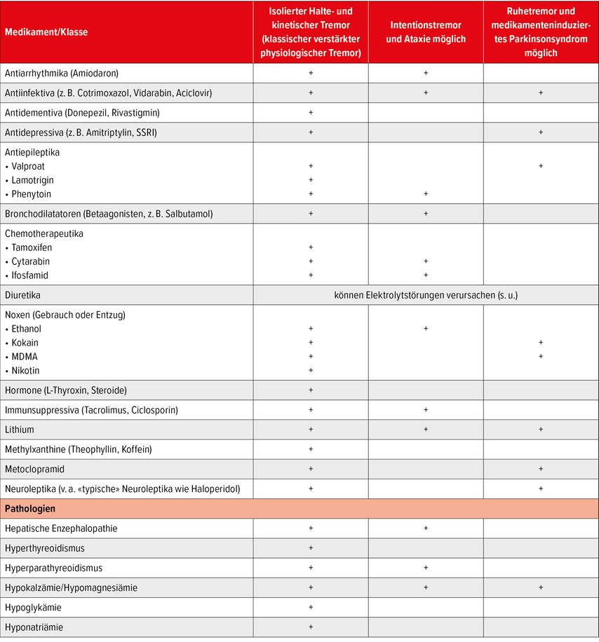 In der hausärztlichen Praxis besonders relevant ist die Abgrenzung eines verstärkten physiologischen von einem essenziellen Tremor. Beides sind Aktionstremores beider Hände. Der essenzielle Tremor ist meist eher ein kinetischer als ein Haltetremor, entwickelt sich langsam über Jahre und kann sich dabei in den Kopf und die Stimme ausbreiten. Oft ist die Familienanamnese positiv und Alkoholkonsum führt zur Tremorlinderung.20 Beim verstärkten physiologischen Tremor hingegen ist die Haltetremorkomponente typischerweise stärker ausgeprägt als der kinetische Tremor. Die Amplitude ist sehr klein, die Frequenz hoch. Ein Einbezug anderer Körperteile als der Hände ist ungewöhnlich. Fast immer gibt es eine identifizierbare Ursache. Zu den häufigsten exogenen Auslösern gehören Medikamente wie Amiodaron, Lithium, Valproat, Immunsuppressiva, Bronchodilatatoren, Neuroleptika oder selektive Serotonin-Wiederaufnahmehemmer (Tab.1).21,22 Dabei ist wichtig zu verstehen, dass manche Medikamente nicht nur einen verstärkten physiologischen Haltetremor, sondern, je nach Substanz (s. Tab.), auch ein zerebelläres Ausfallsyndrom mit Ataxie und Intentionstremor oder ein Parkinsonsyndrom mit Ruhetremor auslösen können.