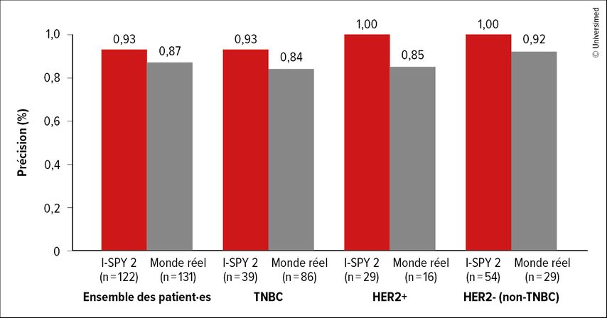 La concentration de ctDNA (MTM/ml) était corrélée à la DRFS indépendamment du sous-type de récepteur (RH+/HER2-, HER2+, triple négatif). Une association linéaire a été observée entre quatre catégories de concentration de ctDNA et la probabilité de récidive. Les chercheur·ses ont également développé un modèle prédictif de la DRFS utilisant l’apprentissage automatique, qui s’est avéré très précis pour différents sous-types de cancer du sein et qui a été validé dans l’étude I-SPY-2 ainsi que dans le monde réel (Fig.2). Selon le modèle, la concentration de ctDNA est le principal facteur prédictif de la DRFS parmi les facteurs pronostiques disponibles au moment du diagnostic.