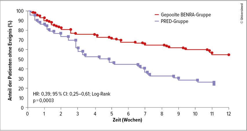 Abb. 1: ABRA-Studie: Kaplan-Meier-Plot der Zeit bis zum ersten Therapieversagen in der Prednisolon- (Prednisolon alleine; PRED) und der gepoolten Benralizumab-Behandlungsgruppe (Benralizumab-Monotherapie und Benralizumab plus Prednisolon; BENRA) (modifiziert nach Ramakrishnan S et al. 2025)9