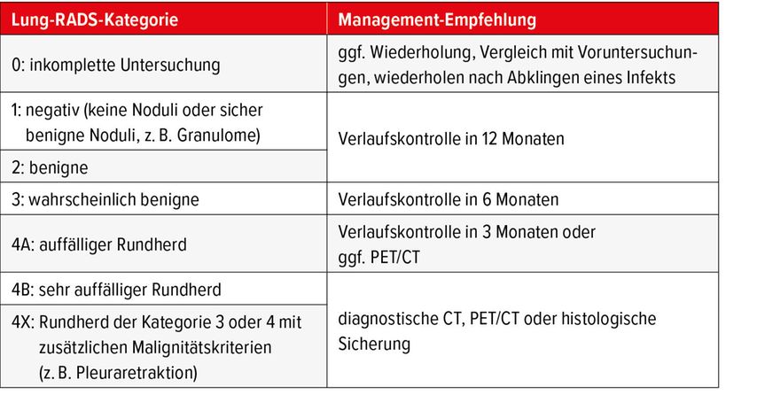 Bei der Auswertung der Bilder wird eine einheitliche Befundstruktur verwendet, welche die Vollständigkeit, Reproduzierbarkeit und interdisziplinäre Kommunikation verbessert und standardisiert. Der entscheidende Bestandteil des strukturierten Befunds ist die Risikoabschätzung hinsichtlich der Wahrscheinlichkeit für das Vorliegen eines Lungenkarzinoms. Unterschiedliche Verfahren können hier eingesetzt werden, die über die weitgehend bekannten Fleischner-Kriterien hinausgehen,8 da die Screening-Population ein anderes Risikoprofil aufweist als die allgemeine Bevölkerung. In Zürich wird das System des American College of Radiology verwendet, die Lung-RADS-Kriterien.9 Diese Kriterien richten sich ausschliesslich nach den bildmorphologischen Charakteristika der Lungenrundherde. Aus der jeweiligen Einteilung lassen sich weitere Handlungsempfehlungen ableiten, wie in Tabelle 1 dargestellt.