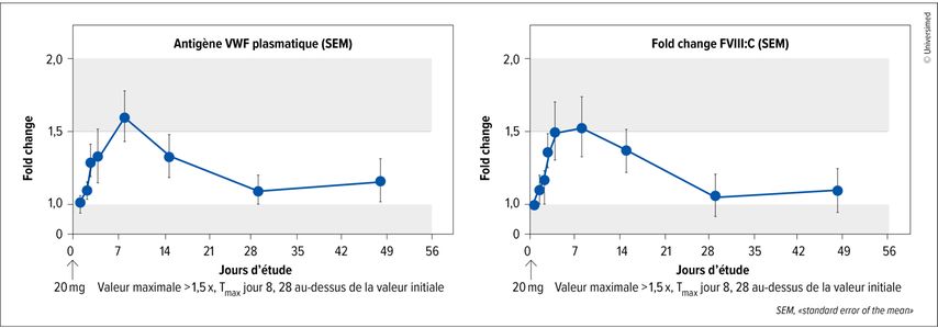 Sous la plus faible dose de HMB-002, à savoir 20mg, le VWF et le FVIII ont été multipliés par 1,5. Les concentrations maximales dans le plasma ont été mesurées à chaque fois au jour 8 et les valeurs sont restées supérieures aux valeurs initiales pendant 28 jours après l’administration (Fig.2). La génération de thrombine a atteint une valeur maximale correspondant à 65% du FVIII. Sur la base des données prometteuses, l’étude VELORA Pioneer poursuit le recrutement ainsi que l’escalade de dose et soutient la poursuite du développement de HMB-002 en tant que traitement prophylactique dans la VWD.