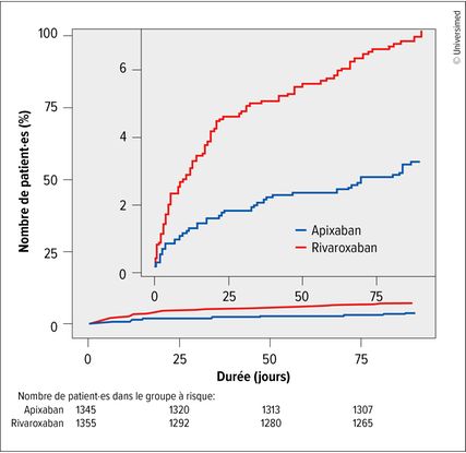 Des hémorragies cliniquement significatives (hémorragies sévères et hémorragies non sévères cliniquement significatives) ont été observées chez 3,3% des patient·es sous apixaban par rapport à 7,2% sous rivaroxaban (OR: 0,44; IC à 95%: 0,31–0,63; p=0,00001; Fig.1). Des hémorragies sévères sont survenues chez 0,4% des patient·es sous apixaban et 2,3% sous rivaroxaban.
