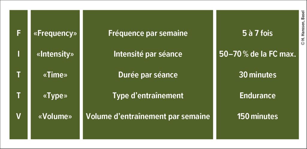 Il est prouvé que le simple fait d’aborder la question de l’AP avec les patient·es entraîne déjà une augmentation de celle-ci.1 Le schéma «Ask-Assess-Advice» s’impose à cet effet. Pour aller plus loin et prescrire avec succès un traitement par l’AP, il est recommandé d’appliquer le principe FITT(V) (Fig.2). La fréquence (F), l’intensité (I), la durée («time», T), le type (T) et le volume (V) permettent ainsi de déterminer les modalités de base de l’entraînement. Une fréquence (F) de 5 à 7 fois par semaine est considérée comme optimale. Pour l’intensité (I), il existe une valeur optimale qui se situe dans la zone d’effort d’intensité modérée à faible (60–75% de la fréquence cardiaque maximale). La durée (T) est idéalement de 30minutes par jour, ce qui se traduit par un objectif hebdomadaire de 150minutes. En outre, un entraînement de renforcement musculaire doit être effectué 2 à 3 fois par semaine, à une intensité entre 50 et 70% d’une répétition maximum sur 3 séries de 15 répétitions des six grands groupes musculaires, dans le sens d’un entraînement de renforcement musculaired’endurance. Une augmentation progressive du volume d’entraînement doit permettre de ne pas décourager les patient·es. Au début, on peut par exemple prescrire 15minutes trois fois par semaine, en fonction de la situation initiale de chaque personne. À l’étape suivante, la fréquence ou la durée peut être augmentée. L’intensité doit être augmentée en dernier. En outre, il faut veiller à éviter les périodes d’inactivité physique prolongées au quotidien. Tout au long du processus, la prise de décision doit être partagée («shared decision making»), car la motivation des patient·es est essentielle pour le succès de la modification du mode de vie. Le choix du programme doit donc tenir compte de leurs préférences et de la faisabilité par les patient·es («patient-centered care»).
