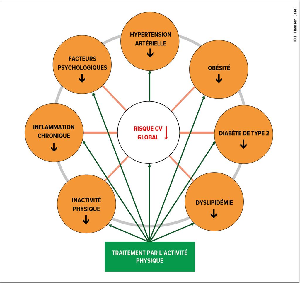 Fig. 1: L’effet du traitement par l’activité physique comme «polypilule» dans le traitement des facteurs de risque cardiométabolique (modifiée selon Hanssen 2023)3