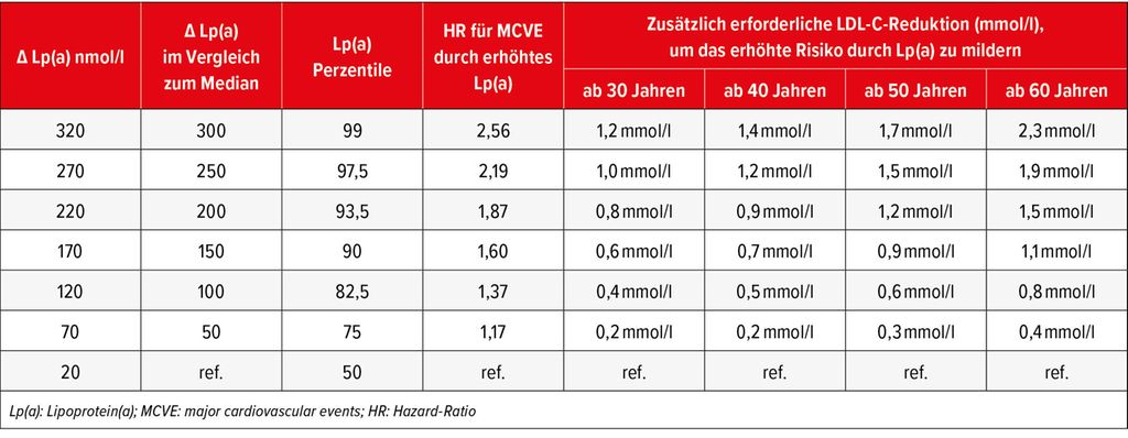 Tab. 1: Quantitative Schätzung der zusätzlich erforderlichen LDL-C-Reduktion, um das durch zunehmend höhere Lp(a)-Spiegel verursachte erhöhte Risiko für schwerwiegende kardiovaskuläre Ereignisse zu mindern (modifiziert nach Kornenberg F et al. 2022)2