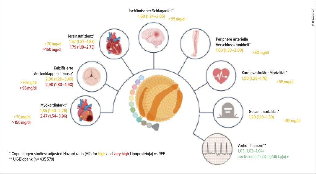 1 Nordestgaard BG et al.: Lipoprotein(a) as a cardiovascular risk factor: current status. Eur Heart J 2010; 31: 2844-53 2 Kronenberg F et al.: Lipoprotein(a) in atherosclerotic cardiovascular disease and aortic stenosis: a European Atherosclerosis Society consensus statement. Eur Heart J 2022; 43: 3925-46 3 Nordestgaard BG et al.: Lipoprotein(a) and cardiovascular disease. Lancet 2024; 404: 1255-64 4 Tsimikas S: A test in context: lipoprotein(a): diagnosis, prognosis, controversies, and emerging Therapies. J Am Coll Cardiol 2017; 69: 692-711 5 Tsimikas S et al.: NHLBI working group recommendations to reduce lipoprotein(a)-mediated risk of cardiovascular disease and aortic stenosis. J Am Coll Cardiol 2018; 71: 177-92 6 Reuser A et al.: Lipoprotein(a). Dtsch Med Wochenschr 2022; 147: 1564-69 7 Erqou S et al.: Lipoprotein(a) concentration and the risk of coronary heart disease, stroke, and nonvascular mortality. JAMA 2009; 302: 412-23 8 Patel AP et al.: Lp(a) (lipoprotein(a)) concentrations and incident atherosclerotic cardiovascular disease: new insights from a large national biobank. Arterioscler Thromb Vasc Biol 2021; 41: 465-74 9 Arsenault BJ, Kamstrup PR: Lipoprotein(a) and cardiovascular and valvular diseases: A genetic epidemiological perspective. Atherosclerosis 2022; 349: 7-16 10 Mohammadi-Shemirani P et al.: Elevated lipoprotein(a) and risk of atrial fibrillation: an observational and mendelian randomization study. J Am Coll Cardiol 2022; 79: 1579-90 11 Thanassoulis G et al.: Genetic associations with valvular calcification and aortic stenosis. N Engl J Med 2013; 368: 503-12 12 Bittner VA et al.: Effect of alirocumab on lipoprotein(a) and cardiovascular risk after acute coronary syndrome. J Am Coll Cardiol 2020; 75: 133-44 13 O’Donoghue ML et al.: Lipoprotein(a), PCSK9 inhibition, and cardiovascular risk. Circulation 2019; 139: 1483-92 14 Ray KK et al.: Effect of an siRNA therapeutic targeting PCSK9 on atherogenic lipoproteins: prespecified secondary end points in ORION 1. Circulation 2018; 138: 1304-16 15 Tsimikas S et al.: Lipoprotein(a) reduction in persons with cardiovascular disease. N Engl J Med 2020; 382: 244-55 16 Cho L et al.: Design and rationale of Lp(a) HORIZON trial: Assessing the effect of lipoprotein(a) lowering with pelacarsen on major cardiovascular events in patients with CVD and elevated Lp(a). Am Heart J 2025; 287: 1-9 17 Kastelein JJP et al.: Obicetrapib: reversing the tide of CETP inhibitor disappointments. Current Atherosclerosis Reports 2024; 26: 35-44 18 Nicholls SJ et al.: Lipid lowering effects of the CETP inhibitor obicetrapib in combination with high-intensity statins: a randomized phase 2 trial. Nat Med 2022; 28: 1672-8