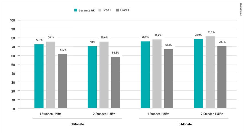 Ein innovatives Verfahren zur Behandlung der AK ist die indoor angewandte (simulierte) photodynamische Tageslicht-Therapie (PDT), bei der Lampen mit Tageslichtspektrum zum Einsatz kommen. In einer prospektiven, randomisierten Vergleichsstudie wurde die Indoor-Tageslichttherapie MAL-PDT mit unterschiedlichen Beleuchtungszeiten von 1 bzw. 2 Stunden an jeweils einem Patienten mit AK auf der Kopfhaut verglichen. Dabei zeigte sich kein statistisch signifikanter Unterschied in der Wirksamkeit zwischen den beiden Beleuchtungszeiten, sowohl nach 3 bzw. 6 Monaten als auch bei den AK-Gruppierungen (Abb.1).11Mehrere Produkte sind auf dem Markt, es gibt kein einheitliches Protokoll, wie Fargnoli erläuterte, sie wies auf eine Reihe von Vorzügen gegenüber der Standard-PDT hin. Die Methode kann das ganze Jahr unverändert und unabhängig vom Wetter angewandt werden, die Exposition ist standardisierbar und reproduzierbar. Die Lampen produzieren keine UV-Strahlung, es wird folglich kein Sonnenschutz benötigt. Eine multizentrische Studie aus Deutschland, für die unterschiedliche Lampen eingesetzt wurden, zeigte gute Wirksamkeit, geringe Nebenwirkungen und hohe Patientenzufriedenheit.12