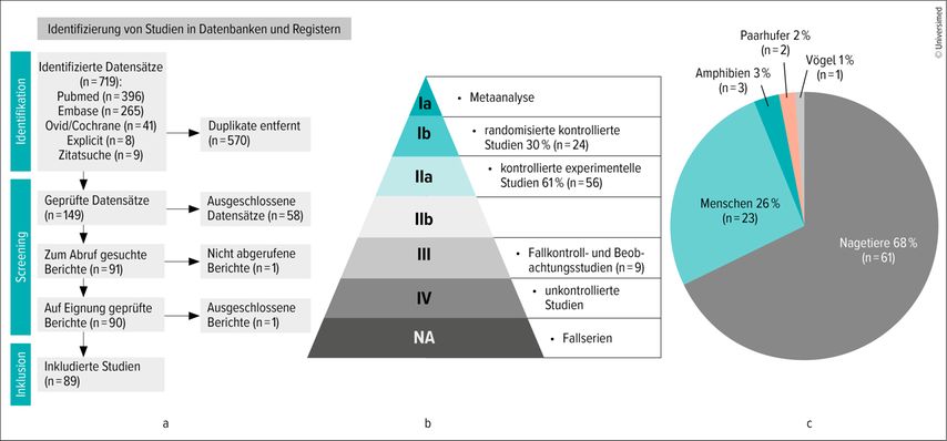 Es konnten 89 Studien, darunter 24 randomisierte, kontrollierte, experimentelle Studien und 56 kontrollierte, experimentelle Studien, inkludiert werden (Abb.1a und b). 68% der Studien wurden an Nagetieren, 26%an Menschen und humanen Zelllinien und 6% an Amphibien, Vögeln und Paarhufern durchgeführt (Abb.1c).
