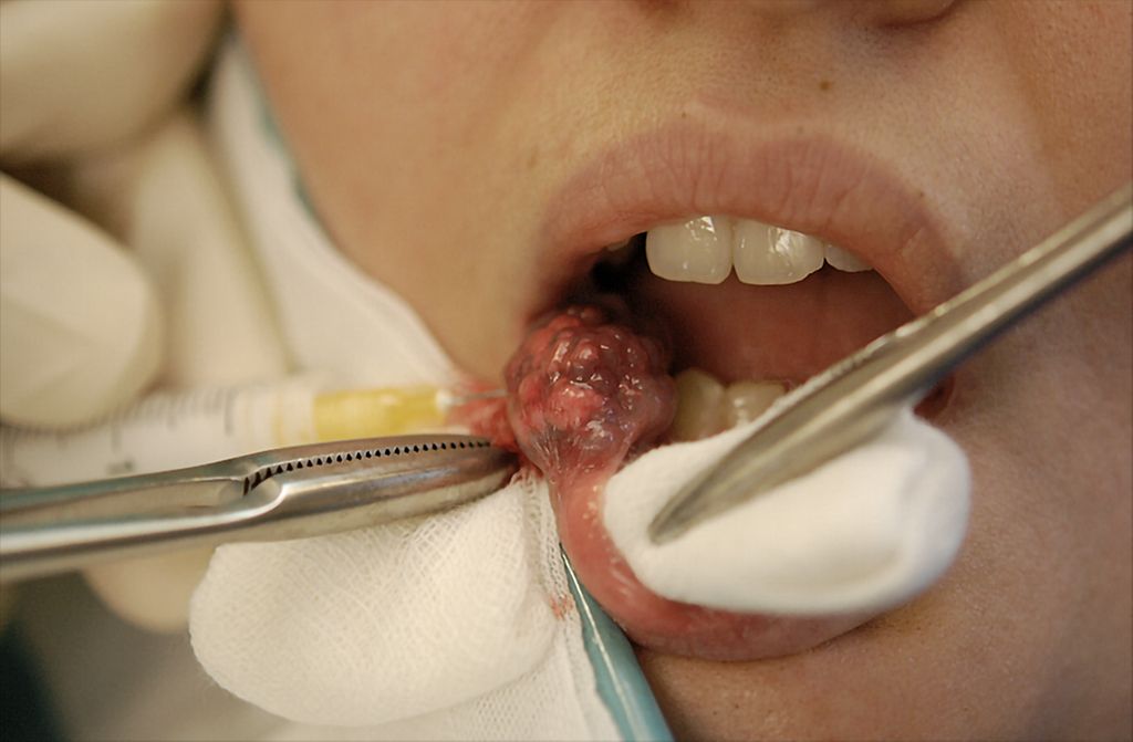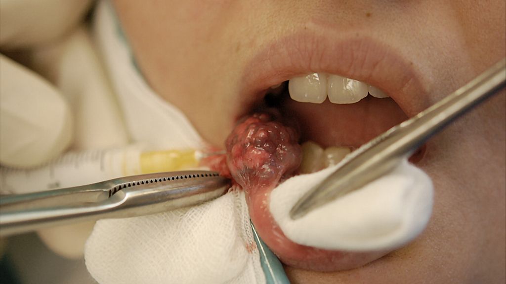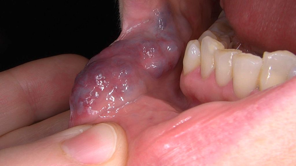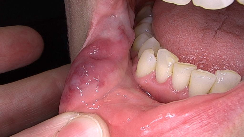 Abb. 1a: Vor Behandlungsbeginn ausgeprägte, knotige Veränderungen an der Innenseite der Mundschleimhaut