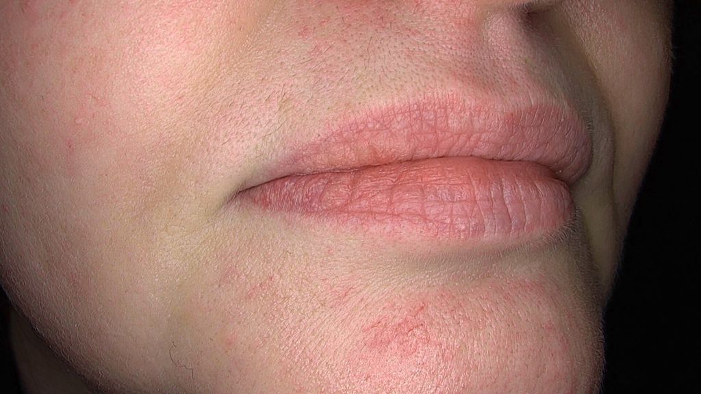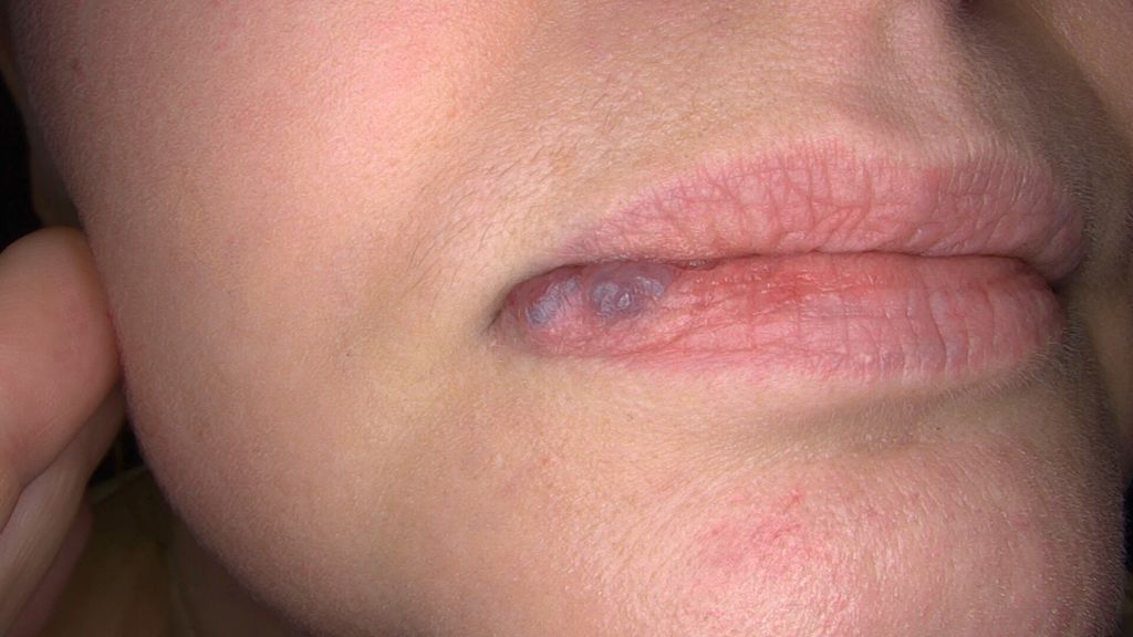 Die Patientin berichtete über ein wiederholtes Auftreten der Symptome und suchte nach einer dauerhaften Lösung. Ebenso berichtete sie, dass die Veränderungen sie ästhetisch störten. Die Knoten an der Innenseite der Lippe beeinträchtigten die Nahrungsaufnahme und waren im Alltag stark belastend. Nach der Erstbeurteilung der bestehenden vaskulären, lividen Verfärbung der rechtsseitigen Unterlippe beantragten wir aufgrund von eindeutig vorhandenem Krankheitswert eine Kostengutsprache. Nach erfolgter Zusage der Kostenübernahme erfolgte Ende April 2024 erstmals die Behandlung der Läsion mittels Gefässlaser. Wir verwendeten einen langgepulsten Nd:YAG-Laser mit 1064nm, 40ms, 5mm-Spot bei 140–160J/m2 mit Luftkühlung.