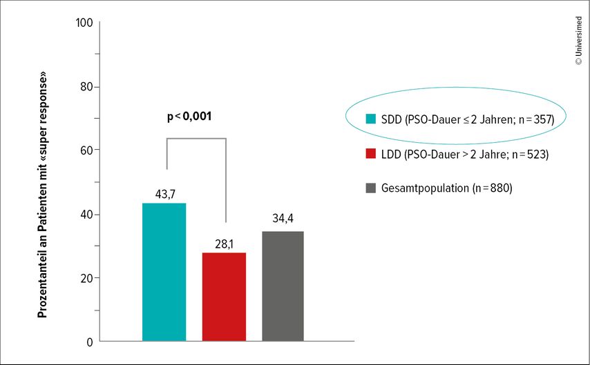 Abb. 1: GUIDE-Studie – Patienten mit einer PSO-Dauer ≤2 Jahren erreichten am häufigsten eine «super response» unter Guselkumab (modifiziert nach Schäkel et al. 2023)2