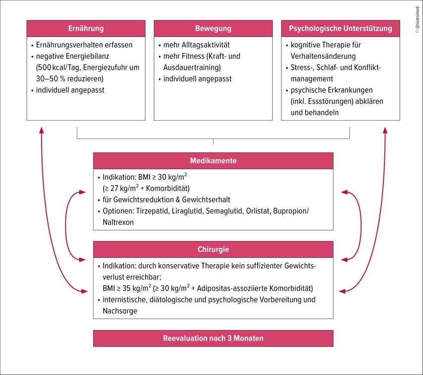 Zusätzlich zur Basistherapie, der Lebensstilmodifikation, sollte die Notwendigkeit einer Pharmakotherapie oder auch einer metabolisch-bariatrischen Chirurgie geprüft werden.