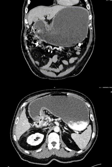 Abb. 1 und 2: Computertomografie Abdomen: massiv dilatierter Magen mit Kalibersprung am Pylorus und tumoröser Infiltration ausgehend vom Pankreaskopf