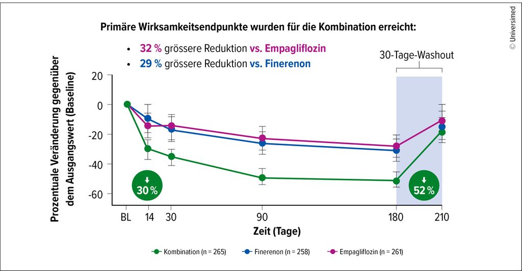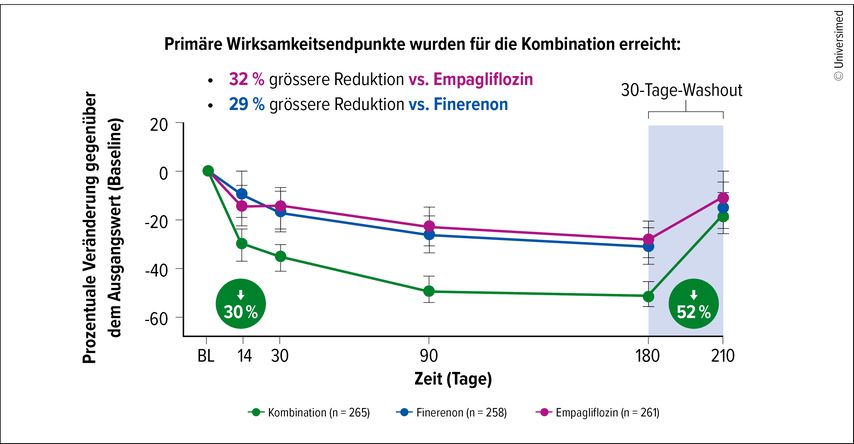 Die Kombinationstherapie zeigte eine signifikant bessere Reduktion des UACR von 32% vs. Empagliflozin alleine (95% CI: 41–21; p<0,001) und 29% vs. Finerenon alleine (95% CI: 39–18; p<0,001) an Tag 180 (Abb.1). Während der Nachbeobachtungsphase nach Absetzen der Therapien näherte sich das Verhältnis wieder dem Ausgangswert an.6