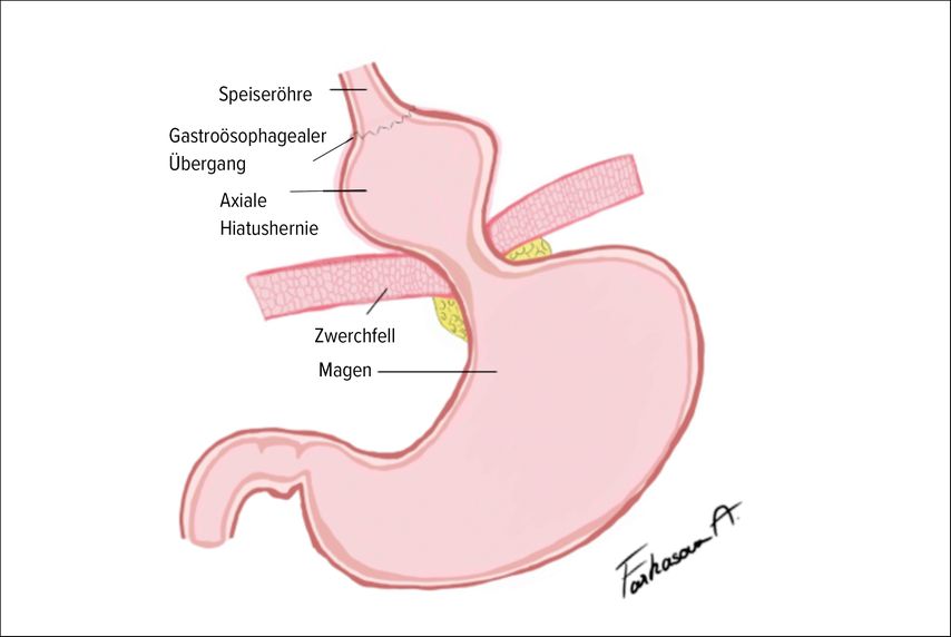 1 Nirwan JS et al.: Global prevalence and risk factors of gastro-oesophageal reflux disease (GORD): Systematic Review with Meta-analysis. Sci Rep 2020; 10: 5814 2 Dunbar KB: Gastroesophageal reflux disease. Ann Intern Med 2024; 177: 113-28 3 Gyawali CP et al.: Updates to the modern diagnosis of GERD: Lyon consensus 2.0. Gut 2024; 73: 361-71 4 Heidelbaugh JJ et al.: Atypical presentations of gastroesophageal reflux disease. Am Fam Physician 2008; 78: 483-8 5 Fass R: Gastroesophageal reflux disease. N Engl J Med 2022; 387: 1207-16 6 Maret-Ouda J et al.: Gastroesophageal reflux disease: a review. JAMA 2020; 324: 2536-47 7 Bredenoord AJ et al.: Gastro-oesophageal reflux disease. Lancet 2013; 381: 1933-42 8 Kim J et al.: Hiatal hernia prevalence and natural history on non-contrast CT in the Multi-Ethnic Study of Atherosclerosis (MESA). BMJ Open Gastroenterol 2021; 8: e000565 9 Sifrim D et al.: Review article: acidity and volume of the refluxate in the genesis of gastro-oesophageal reflux disease symptoms. Aliment Pharmacol Ther 2007; 25: 1003-17 10 Watson TJ et al.: Sliding hernia. StatPearls Publishing 2025 11 DGVS et al.: S2k-Leitlinie GERD. AWMF 2024; https://register.awmf.org/de/leitlinien/detail/021-013 ; zuletzt aufgerufen am 14.1.2026 12 Patti MG: An evidence-based approach to the treatment of gastroesophageal reflux disease. JAMA Surg 2016; 151: 73-8 13 Salib M et al.: The Biological Conservative Reconstruction (BIOCORN) procedure: redefining surgical treatment of gastroesophageal reflux disease (GERD) and hiatal hernia through anatomical preservation. Cureus 2025; 17: e94865 14 Attaar M et al.: Crural closure, not fundoplication, results in a significant decrease in lower esophageal sphincter distensibility. Surg Endosc 2022; 36: 3893-901 15 Analatos A et al.: Hiatal hernia repair with tension-free mesh or crural sutures alone in antireflux surgery: a 13-year follow-up of a randomized clinical trial. JAMA Surg 2024; 159: 11-8 16 Köckerling F et al.: What is the reality of hiatal hernia management?-A registry analysis. Front Surg 2020; 7: 584196 17 Gadalla EAY et al.: Comparative study between the effect of Nissen fundoplication and Toupet fundoplication on postoperative manometry findings. A randomized control trial study. Surg Endosc 2025; 39: 7281-91 18 Salman MA et al.: Nissen versus toupet fundoplication for gastro-oesophageal reflux disease, short and long-term outcomes. A systematic review and meta-analysis. Surg Laparosc Endosc Percutan Tech 2023; 33 171-83 19 Peristeri DV et al.: Long-term efficacy of total versus posterior partial fundoplication in patients with gastro-oesophageal reflux disease: a systematic review and meta-analysis. Ann R Coll Surg Engl 2024; 106: 569-75 20 Vaezi MF et al.: ACG Clinical Guidelines: Diagnosis and management of achalasia. Am J Gastroenterol 2020; 115: 1393-411 21 Siddaiah-Subramanya M et al.: Anterior Dor or posterior Toupet with Heller myotomy for Achalasia Cardia: A systematic review and meta-analysis. World J Surg 2019; 43: 1563-70 22 Lødrup A et al.: Use of proton pump inhibitors after antireflux surgery: a nationwide register-based follow-up study. Gut 2014; 63: 1544-9 23 Liu L et al.: Robotic-assisted foregut surgery is associated with lower rates of complication and shorter post-operative length of stay. Surg Endosc 2023; 37: 2800-5