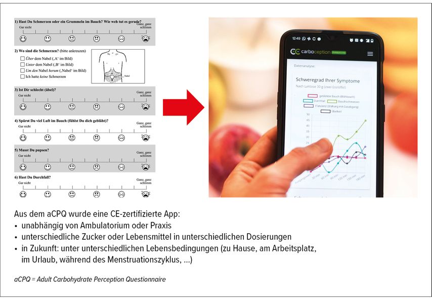 Die App «Carboception» wurde auf der Basis des aCPQ entwickelt, um Patient:innen mit Malabsorption und Intoleranzen, Hausärzt:innen und Diätolog:innen eine strukturierte Möglichkeit zur Erfassung und Analyse ihrer Symptome zu bieten. Mithilfe von validierten Symptomskalen können Betroffene dokumentieren, welche Lebensmittel zu Beschwerden führen. Diese Daten ermöglichen eine personalisierte Anpassung der Diät und verbessern die Kommunikation zwischen Patient:innen und behandelnden Ärzt:innen sowie Diätolog:innen (Abb.2).