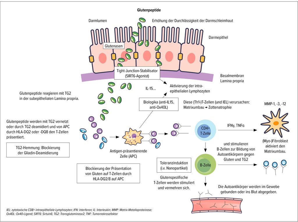 Viele Patienten mit Zöliakie haben trotz glutenfreier Diät weiterhin Beschwerden. Zurzeit befinden sich einige innovative therapeutische Ansätze in Entwicklung: u.a. ein Inhibitor der intestinalen Transglutaminase 2, Antikörper gegen Interleukin 15 und der Ox40-Ligand, ein Sirtuin-6-Agonist zur Verbesserung der intestinalen Barriere sowie Wirkstoffe zur Induktion einer Glutentoleranz.