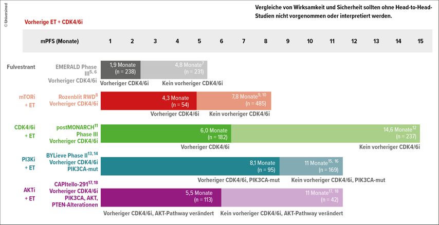 Unabhängig von der Substanzklasse, kann man bei allen hormonsensiblen HER2-negativen Patientinnen im metastasierten Setting beobachten, dass das mediane PFS nach Vortherapie mit einem CDK4/6-Hemmer deutlich verkürzt ist im Vergleich zu den entsprechenden Zulassungsstudien. Ein solcher Vergleich ist natürlich in Ermangelung von Head-to-Head-Studien wissenschaftlich nicht zulässig, soll uns aber den Eindruck vermitteln, welche onkologisch wertvolle Arbeit CDK4/6-Hemmer im First-Line-metastasierten Setting leisten (Abb. 1).