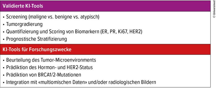 Die Brustpathologie bildet keine Ausnahme in diesem Kontext tiefgreifender Veränderungen in der Pathologie und generell in der Medizin, die durch KI ausgelöst werden. Mehrere KI-Tools sind für die klinische Anwendung zugelassen und validiert, wobei die unten aufgelisteten zu den wichtigsten zählen. Aiforia® bietet KI-gestützte Bildanalyse für die Mammapathologie, insbesondere zur Erkennung und Quantifizierung von Tumorzellen, Biomarkern (z.B. ER, PR, HER2, Ki-67) und zur Unterstützung der Diagnostik. Die Validierung erfolgt in multizentrischen Studien mit hoher Übereinstimmung mit manuellen Pathologiebefunden; Die CE-IVD-Zulassung für klinische Anwendungen in Europa ist vorhanden.20,21 PANProfiler Breast ist ein UKCA-markiertes Deep-Learning-Tool, das aus H&E-gefärbten Schnitten den ER- und PR-Status sowie HER2-Negativität vorhersagen kann. In Blindvalidierungsstudien zeigte das Tool eine hohe Konkordanz (90–93% für ER, 86–91% für PR, 91–100% für HER2-negativ) mit den pathologischen Standardbefunden. Die Zulassung besteht für den klinischen Einsatz im Vereinigten Königreich.22 Stratipath Breast ist ein CE-IVD-zertifiziertes KI-Tool zur Risikostratifizierung von Brustkrebspatientinnen anhand digitaler H&E-Schnitte. Stratipath Breast bietet eine schnellere und kostengünstigere Alternative zu Genexpressionstests. Durch den Einsatz von KI zur Analyse routinemässiger Pathologieschnitte können Laborzeit und -kosten reduziert werden, sodass Risikoeinschätzungen innerhalb einer Stunde statt erst nach mehreren Wochen vorliegen. Die Validierung erfolgte in multizentrischen Kohortenstudien.23,24 Mindpeak entwickelt KI-Lösungen zur automatisierten Quantifizierung von Biomarkern (z.B. ER, PR, Ki-67) in der Mammapathologie. Die Validierung umfasst multizentrische Studien mit hoher Übereinstimmung mit manuellen Auswertungen; CE-IVD-Zulassung und FDA-Freigabe für bestimmte Module liegen vor.21 Visiopharm® bietet CE-IVD-zertifizierte KI-Module für die automatisierte Analyse von Brustkrebs-Biomarkern und Tumorcharakteristika. Die Validierung erfolgt durch multizentrische Studien mit Vergleich mit etablierten diagnostischen Methoden.20,21 Paige® ist ein KI-System für die digitale Pathologie, das in den USA von der FDA für bestimmte Anwendungen zugelassen ist. In der Mammapathologie unterstützt Paige die Erkennung und Klassifikation von Brusttumoren; die Validierung umfasst multizentrische Studien.20 Galen IBEX ist eine CE-IVD-zertifizierte KI-Plattform zur Unterstützung der Brustkrebsdiagnostik. Die Validierung erfolgt durch multizentrische Studien; für ausgewählte Module besteht eine FDA-Zulassung.20 Die Integration dieser Tools erfolgt meist als Assistenzsysteme, wobei die finale diagnostische Verantwortung beim Pathologen verbleibt. Die Validierungsstudien zeigen, dass KI die Interobserver-Variabilität reduziert und die Effizienz steigert, ohne die diagnostische Qualität zu kompromittieren.23 Darüber hinaus wurden bisher mehrere hochentwickelte Algorithmen – beispielsweise solche, die die Zusammensetzung des Tumormikromilieus (sog. TME; «tumor microenvironment») und der TILs («tumor infiltrating lymphocytes») quantifizieren oder das Vorliegen spezifischer Mutationen wie BRCA1/2 auf Basis der HE-Morphologie prognostizieren können – primär zu Forschungszwecken entwickelt und sind bislang nicht für den routinediagnostischen Einsatz validiert.25–29