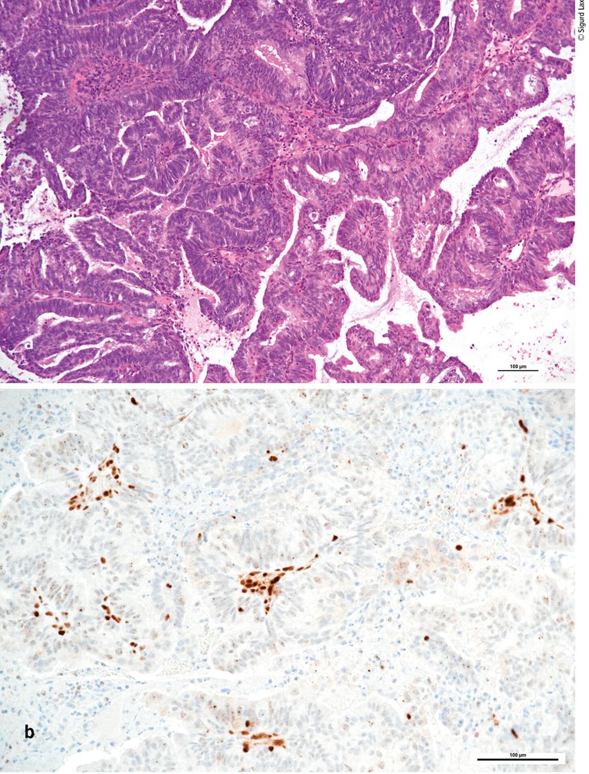 Abb. 1: Gut differenziertes (low-grade/Grad 1) endometrioides Endometriumkarzinom (a) mit immunhistochemischem Verlust von MLH1 infolge von Promotor-Methylierung (b). Die Stromazellen zeigen eine intakte Immunreaktivität für MLH1. HE (a) und DAB (b), Originalvergrößerung 200-fach