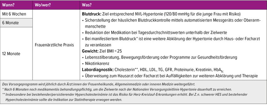 Tab. 1: Vorschlag zur Nachsorge nach HES (modifiziert nach DGGG/OEGGG/SGGG: S2k-Leitlinie Hypertensive Erkrankungen in der Schwangerschaft)1