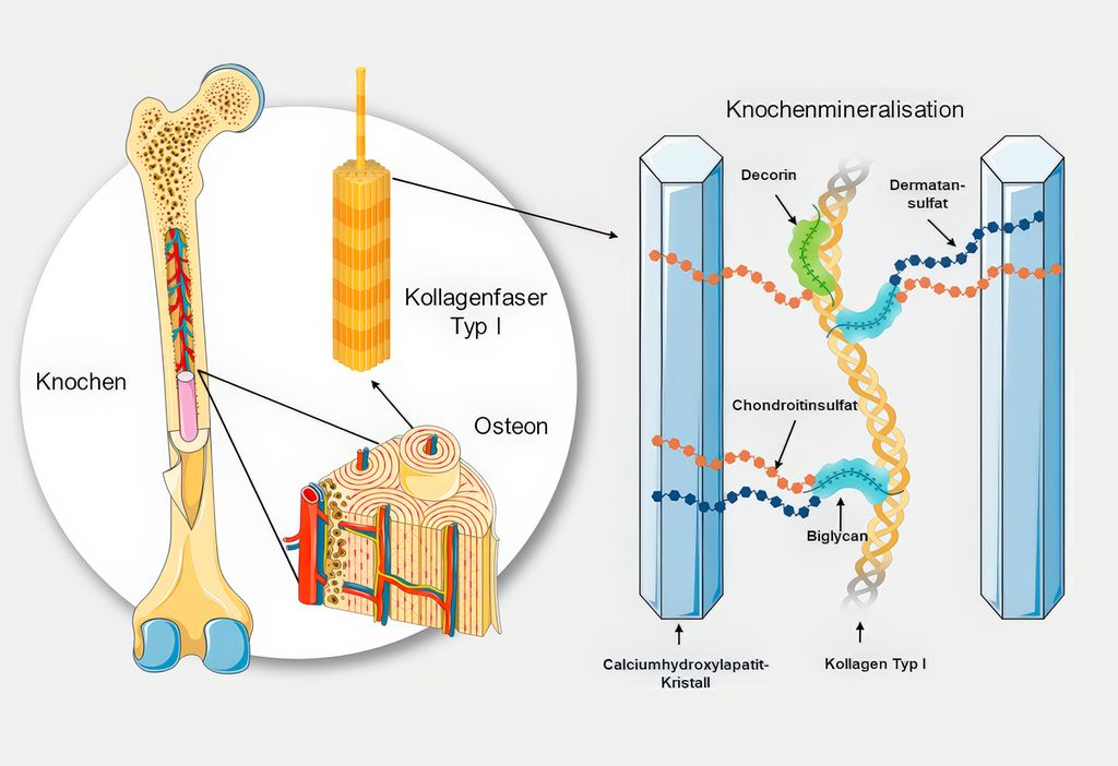 Der Knochen ist ein lebendiges, hochaktives System und weit mehr als ein starres mineralisches Gebilde. Er gleicht einem biologischen Verbundwerkstoff: Wie Stahlbeton vereint er ein flexibles Gerüst mit einer harten mineralischen Komponente. Tatsächlich bestehen rund 40% des Knochens aus organischen Verbindungen wie Kollagen Typ I, Glykosaminoglykanen (GAGs) und Proteinen.1,2 Während das organische Kollagen Typ I die Rolle des „Stahls“ übernimmt und dem Knochen Elastizität sowie Zugfestigkeit verleiht, sorgt das eingelagerte Kalziumphosphat – der „Beton“ – für Härte und Stabilität. Zusätzlich vernetzen die beiden Glykosaminoglykane Chondroitinsulfat und Dermatansulfat das Kollagengerüst mit den Kalziumphosphatkristallen und ermöglichen dadurch erst eine strukturierte Mineralisation. Hyaluronsäure und Elastin erhöhen die Druckfestigkeit, indem sie Wasser binden.3