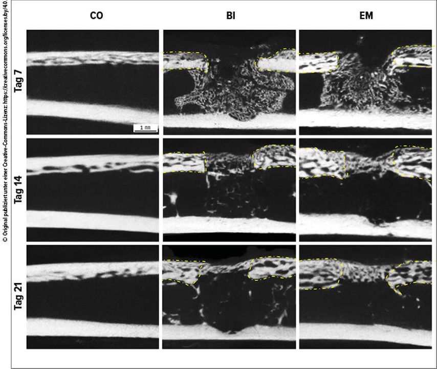 Abb. 3: μCT-Auswertung der Knochenheilung nach Bohrlochverletzung. Gelb gestrichelte Linien markieren die Grenze zwischen bestehendem Knochen und Bohrlochdefekt (n=6). * p<0,05. CO: Kontrolle; BI: Knochenverletzung; EM: Supplementierung mit Eierschalenmembran (modifiziert nach Yashima N et al.)12