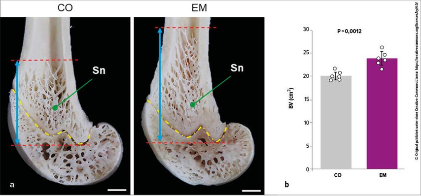 Abb. 2: (a) Makroskopische Ansicht der distalen Femurmetaphyse. (b) Knochenvolumen (BV) berechnet mittels μCT-Analyse (n=6). Sn: Spongiosa. Blaue Pfeile: longitudinale Breite der Spongiosa. Gelbe Linie: Wachstumsfuge. Rote Linien: oberes und unteres Ende der Spongiosa. Maßstab = 1mm. CO: Kontrolle; EM: Eierschalenmembran (modifiziert nach Yashima N et al.)10
