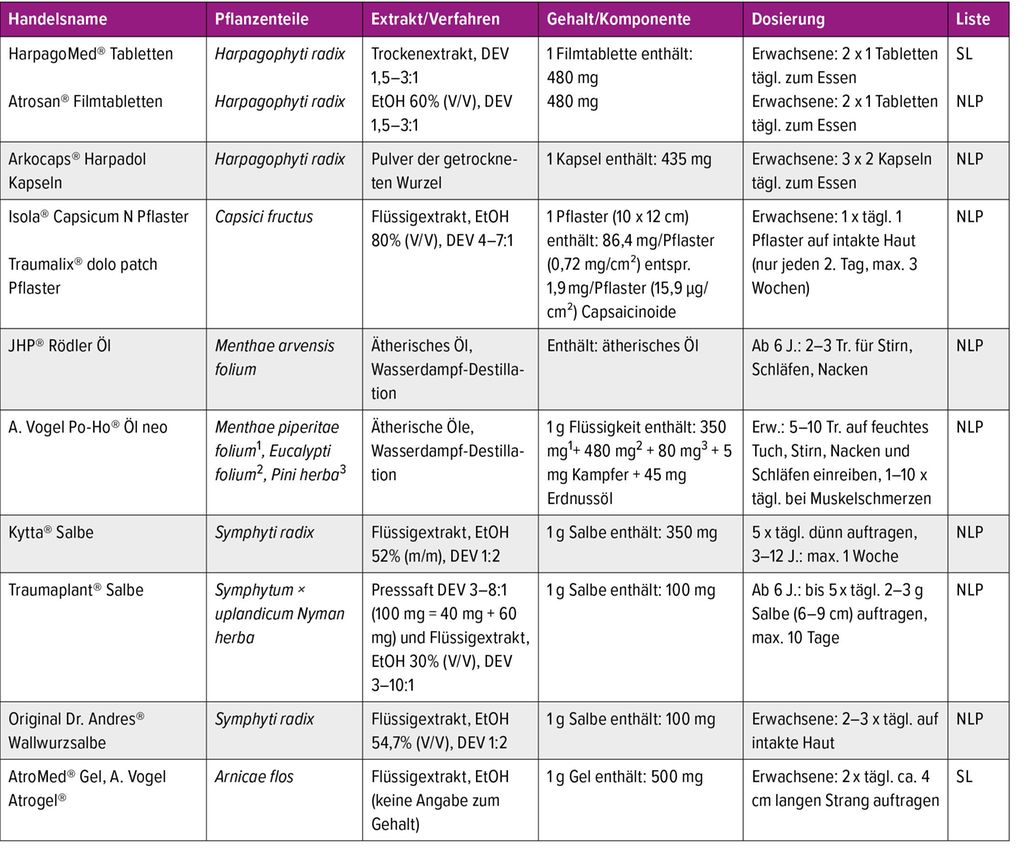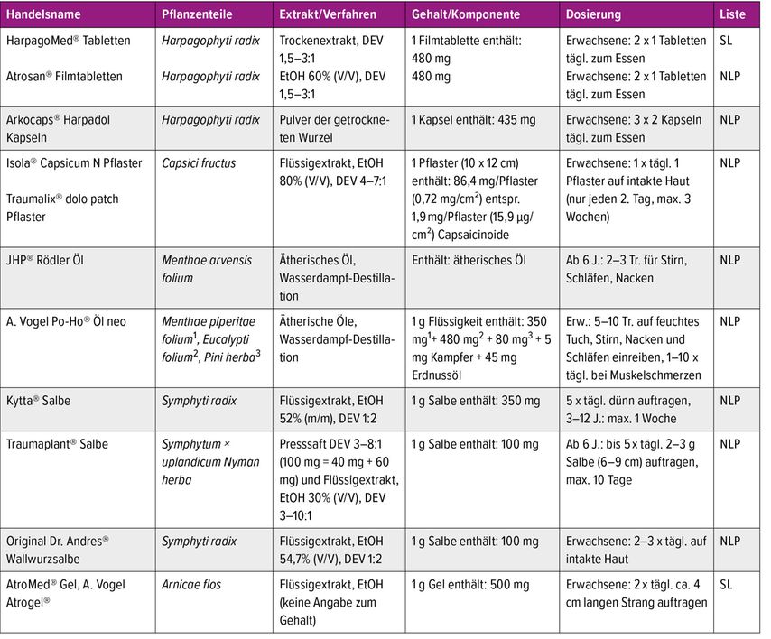 Tab. 1: Phytotherapeutika mit antiinflammatorischer Wirkung bei Gelenksbeschwerden (modifiziert nach Falch B et al.: pharmActuel 2024;1:39) EtOH=Ethanol1