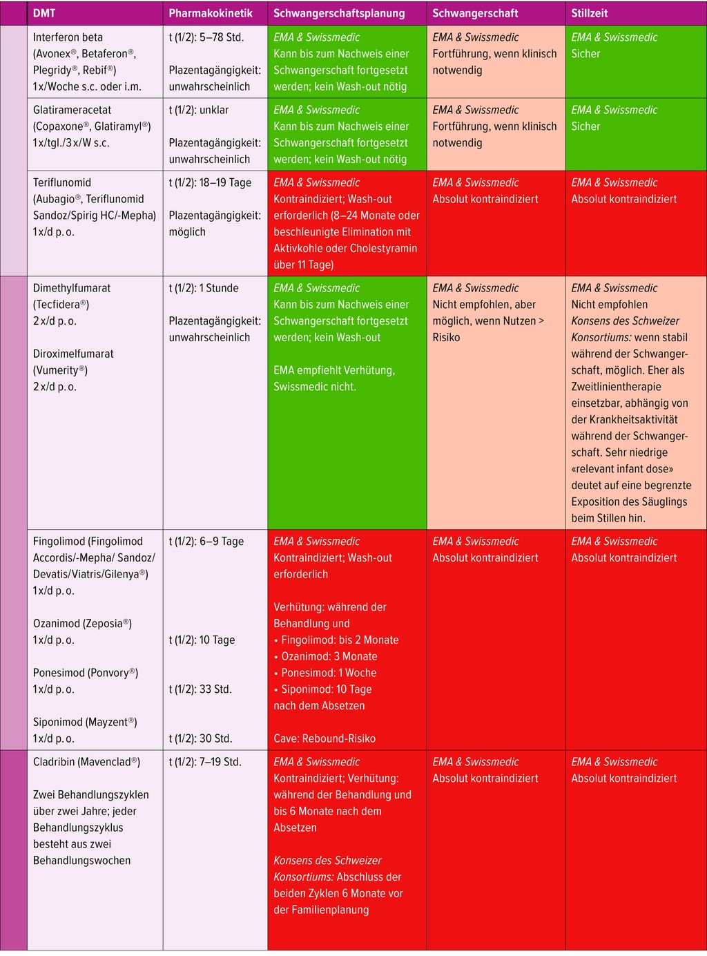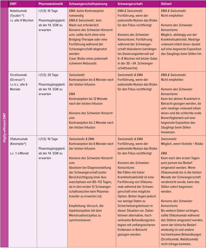 Tab. 1: Die zulässige MS-Therapie vor und während der Schwangerschaft richtet sich in Europa nach den Empfehlungen der EMA (European Medicines Agency), die jedoch nicht immer mit denen von Swissmedicübereinstimmen. Beide Behörden verfolgen einen eher konservativen Ansatz, da nur wenige Studien zu Sicherheitsdaten in der Schwangerschaft vorliegen. Unter Berücksichtigung pharmakologischer Daten (insbesondere Halbwertszeiten) sowie neuer Evidenz, etwa bei Patientinnen, bei denen während der Therapie eine ungewollte Schwangerschaft auftritt, beauftragte 2024 ein Konsortium aus der Schweizerischen Multiplen Sklerose Gesellschaft, der Schweizerischen Neurologischen Gesellschaft und der Schweizerischen Gesellschaft für Gynäkologie und Geburtshilfe eine interdisziplinäre Schweizer Autorengruppe mit der Aufbereitung der aktuellsten evidenzbasierten Daten