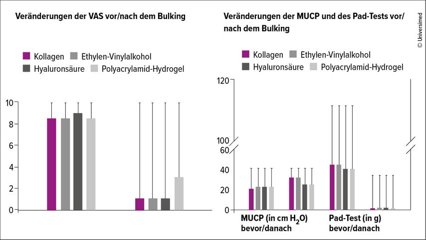 Abb. 3: Periurtethrales Bulking ist effektiv bei Belastungs- und Mischinkontinenz (modifiziert nach Mohr S. et al.)56 VAS = «visual analogue scale», MUCP = «maximum urethral closure pressure»