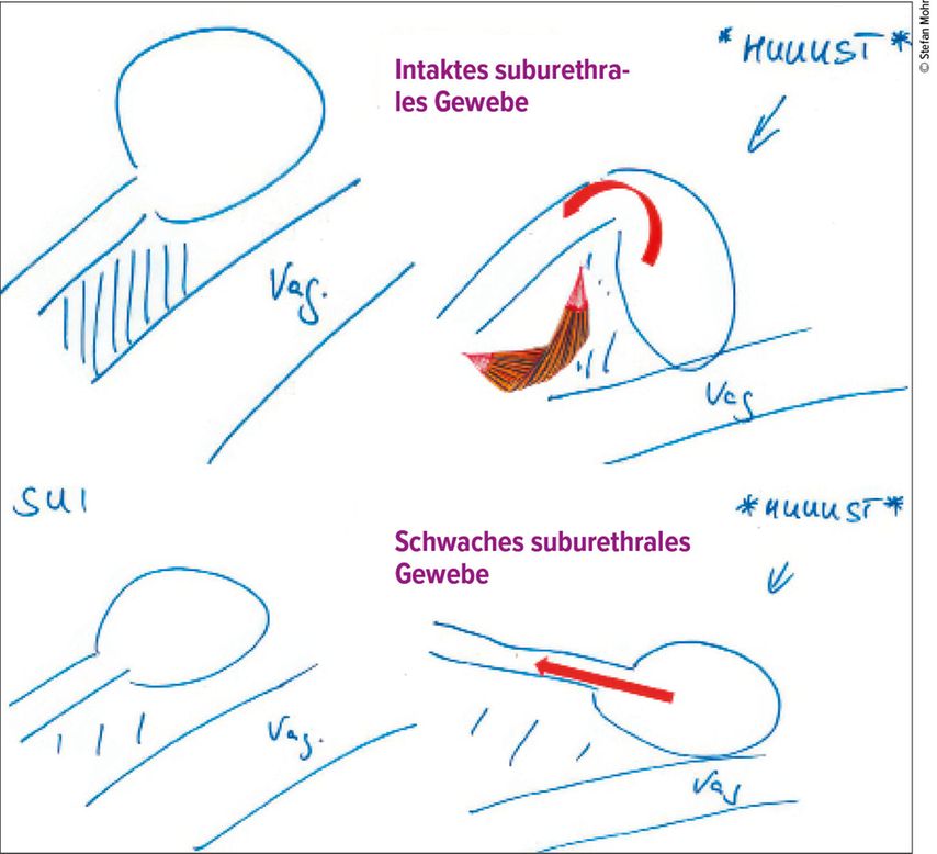 Ätiologisch spielen zwei Mechanismen eine Rolle (Abb. 1). Zum einen führt ein schwacher urethraler Sphinkter (hypotone Urethra) zu ungewolltem Urinabgang bei Belastung (Bauchpresse, Husten, Niesen, Heben, etc.), da der Verschluss der Urethra zu schwach ist. Zum anderen führt aber vor allem auch eine Hypermobilität der Urethra zur SUI, weil das suburethrale Gewebe geschwächt und somit mobil ist und keinen ausreichenden Widerstand mehr bietet: Normalerweise hält dieses Gewebe die Urethra in Position und die Harnblase knickt bei abdominaler Druckerhöhung nach kaudal gegen die Harnröhre ab. Dieses Abknicken verhindert den Urinverlust. Bei schwachem suburethralem Gewebe senkt sich die Harnröhre bei abdominaler Druckerhöhung mit ab, das Abknicken bleibt aus und es kommt zur SUI.5,6 (Abb. 1)