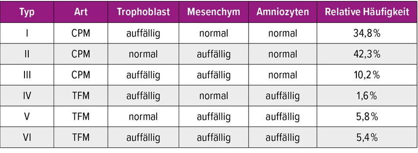 Tab. 1: Inzidenz der verschiedenen Typen von Mosaizismen (CPM und TFM), die nach der Karyotypisierung von Chorionzotten und Amniozyten festgestellt wurden (modifiziert nach Grati FR et al.)3