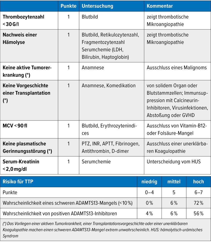 Die TTP ist eines von vielen klinisch ähnlichen Syndromen thrombotischer Mikroangiopathien, muss aber wegen der spezifischen modernen Therapiemöglichkeiten durch die sofortige Bestimmung der ADAMTS13-Aktivität eindeutig diagnostiziert werden. Dazu stehen mittlerweile in den größeren Behandlungszentren im deutschsprachigen Raum gute und schnelle Testsysteme zu Verfügung, die innerhalb weniger Stunden ein valides Ergebnis liefern. Bei stark erniedrigten ADAMTS13-Aktivitätswerten (<10%) kann dann auch mittels einer Verdünnungsreihe eine Quantifizierung des Inhibitortiters erfolgen. Periphere Häuser müssen jedoch eine Citratplasmaprobe zur Bestimmung versenden. Das darf jedoch niemals die sofortige Einleitung einer lebensrettenden Therapie verzögern. Die Wahrscheinlichkeit eines schweren ADAMTS13-Mangels kann mit klinischen Scoringsystemen (z.B. PLASMIC-Score, Tab.1) abgeschätzt werden. Das Vorliegen einer aktiven Tumorerkrankung, einer Organ- oder Stammzelltransplantation oder einer plasmatischen Gerinnungsstörung schließt einen schweren ADAMTS13-Mangel nahezu sicher aus. Ganz zu Beginn müssen alle Untersuchungen zur Beurteilung der Organfunktionen und zur Aufarbeitung der Differenzialdiagnosen durchgeführt werden.