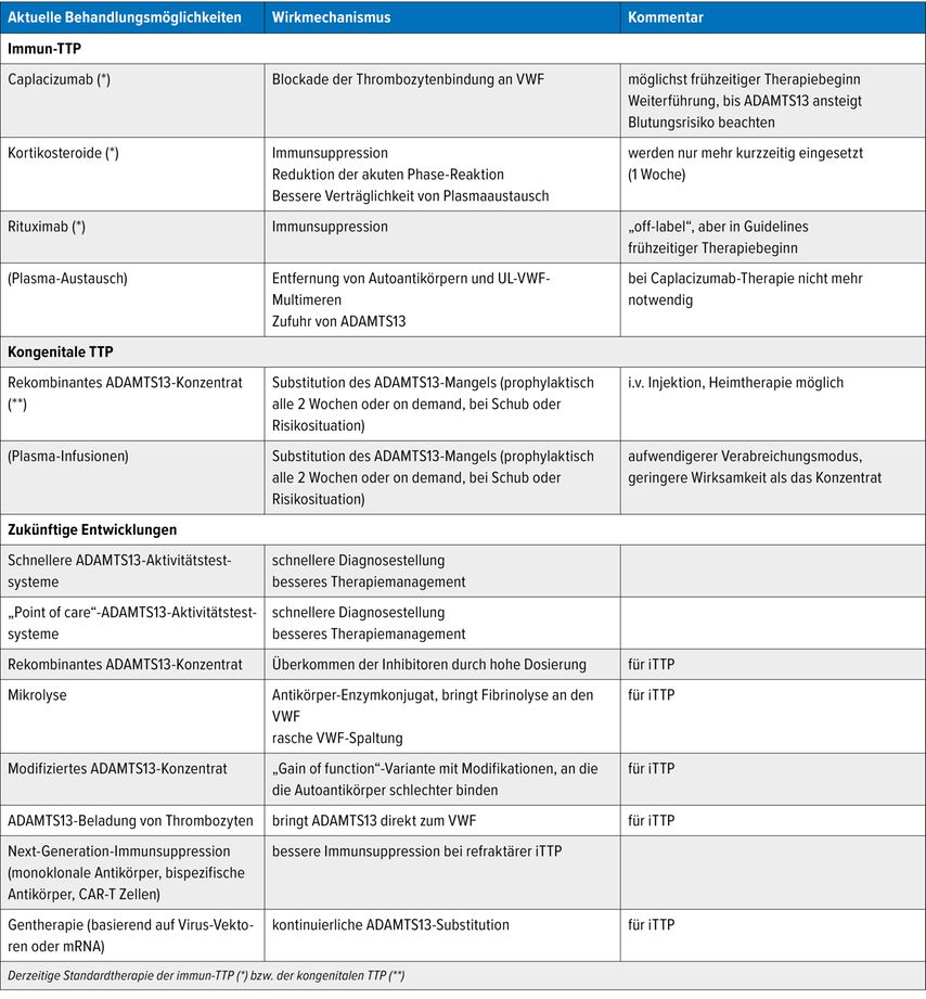 Derzeit laufen weitere Entwicklungen zum Management der TTP. Tabelle 2 gibt einen Überblick über die aktuellen Therapien und zukünftige Therapieoptionen. Doch sowohl bei der Diagnostik als auch bei der Therapie gibt es noch offene Fragen.