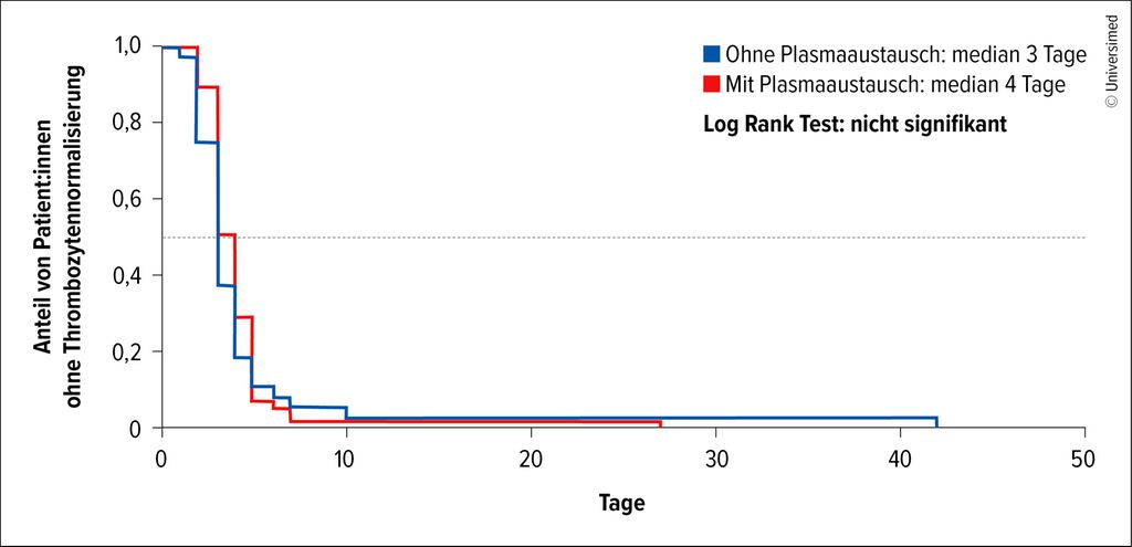 Diese hohe Erfolgsrate von Caplacizumab hat dazu geführt, dass die Notwendigkeit der Plasmaaustauschbehandlungen zunehmend hinterfragt wird. Mittlerweile wurden >100 iTTP-Patient:innen ohne Plasmaaustausch behandelt, wenn sich nach der ersten Gabe von Caplacizumab ein Anstieg der Thrombozytenzahlen als Zeichen eines Therapieansprechens zeigte. Die Patient:innen stammen vor allem aus retrospektiven Kohorten aus Deutschland und Österreich (Kühne L et al., 2024) sowie aus der prospektiven MAYARI-Studie, die heuer am ISTH-Kongress präsentiert wurde. Auch ohne Plasmaaustausch bestehen eine Ansprechrate >99%, eine Thrombozytennormalisierung innerhalb von drei Tagen (Abb.1), eine minimale Exazerbationsrate und eine Mortalität von 0%. Daher wird in Kompetenzzentren keine Plasmaaustauschtherapie mehr eingesetzt.