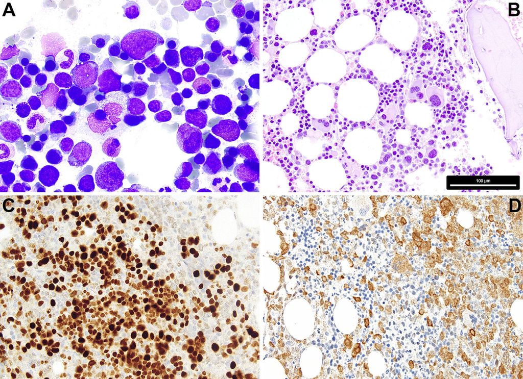 Fig. 1: 1A: Cytologie d’un SMD avec excès de blastes/blastes multipliés; on remarque les petits mégacaryocytes dysplasiques, le trouble de la maturation et les défauts de granulation de la myélopoïèse, la dyserythropoïèse clairsemée et 7% de blastes. 1B: Histopathologie d’un SMD avec del(5q) et mutation monoallélique TP53; on note la présence de quelques mégacaryocytes monolobés nucléaires de petite taille, à côté de mégacaryocytes à noyaux séparés, et le trouble de la maturation myélopoïétique. 1C: Positivité caractéristique de p53 à l’immunohistochimie dans le SMD avec mutations TP53 multi-hit/inactivation biallélique de TP53 (6% de blastes); la protéine p53 mutée dispose d’une demi-vie plus longue et stabilise l’éventuelle p53 de type sauvage (encore) présente, de sorte que la protéine correspondante, qui n’est sinon guère détectable à l’immunohistochimie dans la moelle osseuse, peut être colorée en cas de charge allélique mutée significative, comme dans le cas de mutations TP53 multi-hit/inactivation TP53biallélique. 1D: SMD avec excès de blastes (8% de blastes) et positivité avec l’anticorps anti-NPM1 spécifique de la mutation (PA1-46356); selon l’OMS, le cas doit être classé comme LMA, alors que selon l’ICC, un diagnostic de SMD avec excès de blastes est admissible. La barre de mesure dans B se réfère aux Fig. B–D