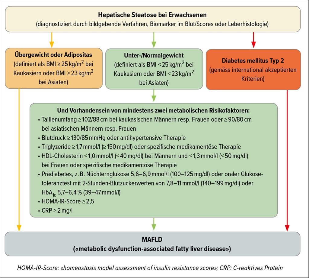 Für die Diagnose der MAFLD müssen die Patienten neben einer hepatischen Steatose zusätzlich an Übergewicht resp. Adipositas oder Diabetes mellitus (DM) leiden oder Zeichen einer metabolischen Dysfunktion aufweisen (Abb. 1).4 Eine verlässliche Methode, um Patienten mit Verdacht auf eine hepatische Steatose für die weitere Abklärung zu selektionieren, ist die Berechnung des «fatty liver index» anhand von BMI, Hüftumfang, Gamma-GT und Triglyzeriden.5 Die Diagnose der Hepatosteatose erfolgt mittels bildgebender Verfahren, wie Ultraschall- und Fibroscanuntersuchung. Eine neuere, aber nicht überall verfügbare Methode zur Quantifizierung des Leberfetts ist das MRI-PDFF («proton density fat fraction»). Die Leberhistologie bei einer MAFLD zeigt typische Veränderungen, wie eine makrovesikuläre Verfettung und Entzündung des Leberparenchyms, Hepatozyten-Ballooning, Fibrosierung und sogenannte Mallory-Denk-Körperchen.