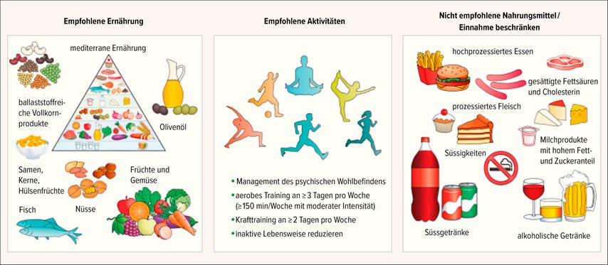 Abb. 1: Lebensstil und Ernährung – Empfehlungen für Patientinnen und Patienten mit MASLD (modifiziert nach Francque SM et al. 2021)16