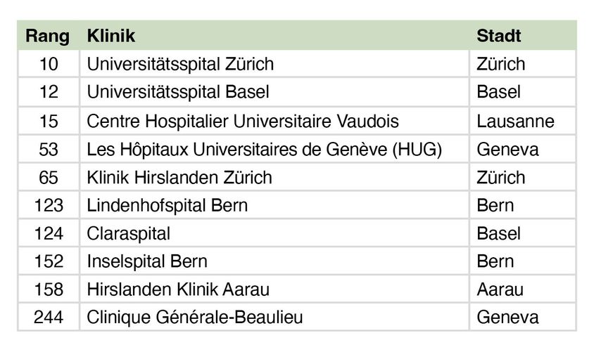 Insgesamt haben es zehn Schweizer Spitäler in das Ranking geschafft. Auf den vordersten Plätzen rangieren die Mayo Clinic – Rochester, die Cleveland Clinic und das Toronto General – University Health Network.