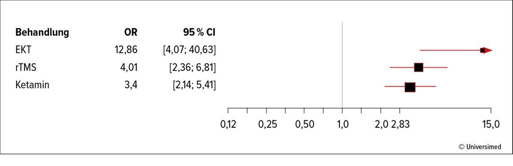 Anhand eines systematischen Reviews mit 69 Studien und 9354 Patient:innen analysierten Saelens et al. die relative Wirksamkeit verschiedener antidepressiver Behandlungen. EKT zeigte dabei eine signifikante Odds-Ratio (OR) von 12,86 (95% CI: 4,07–40,63) gegenüber Placebo. Auch rTMS war Placebo mit einer OR von 4,01 (95% CI: 2,36–6,81) signifikant überlegen und befand sich dabei im Wirksamkeitsbereich von Ketamin (OR: 3,4; 95% CI: 2,14–5,41; Abb. 1).3