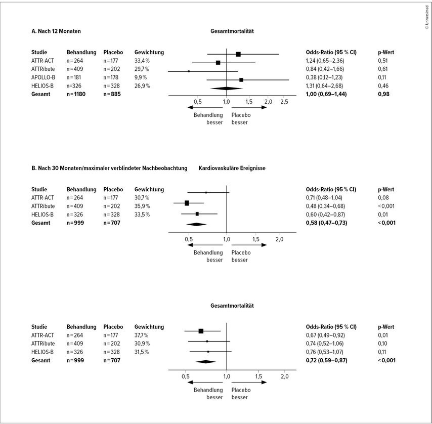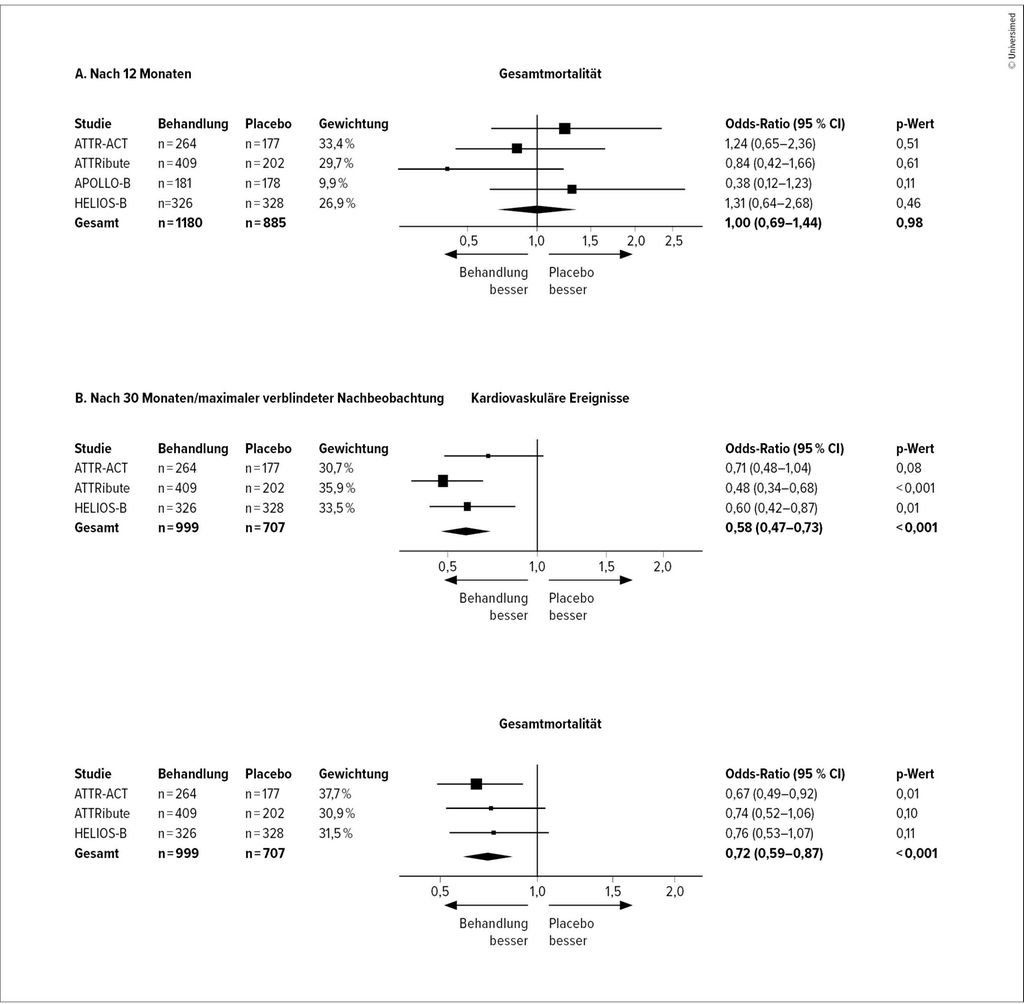 Mortalitätsdaten nach 12 Monaten waren für alle vier Studien verfügbar. Langfristige Auswirkungen von ATTR-spezifischer Therapie wurden in ATTR-ACT, ATTRibute und HELIOS-B untersucht. Bei APOLLO-B endete die Nachbeobachtungszeit nach 12 Monaten. Über alle Studien hinweg zeigte sich nach 12-monatiger Therapie kein positiver Effekt von ATTR-spezifischer Therapie im Vergleich zu Placebo (OR 1,00; 95% CI: 0,69 bis 1,44; p=0,98; I2<0,1%). Mit längerer Therapiedauer zeigte sich am Ende der verblindeten Periode der Studien ein signifikanter Vorteil von ATTR-spezifischer Therapie hinsichtlich Mortalität und kardiovaskulärer Ereignisse, im Sinne einer 28%igen respektive einer 42%igen Risikoreduktion im Vergleich zu Placebo.