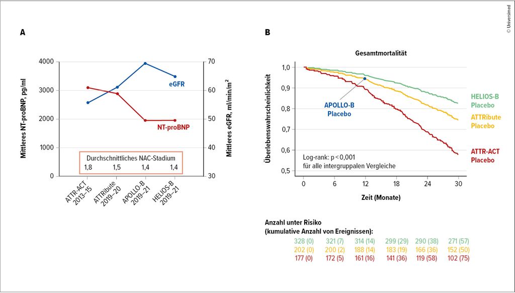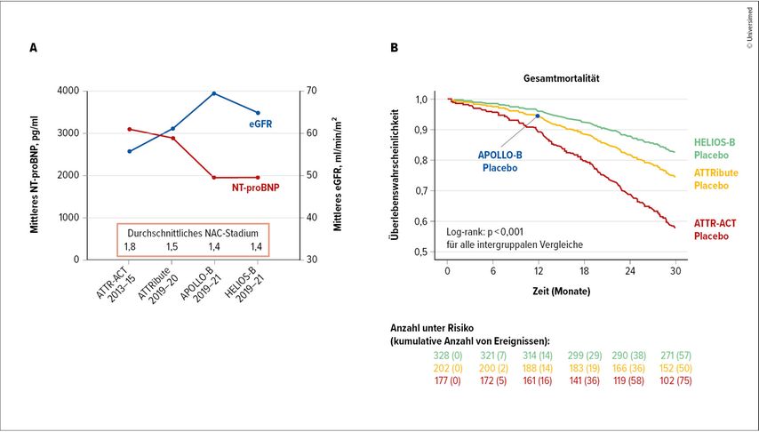 Die Baseline-Charakteristika der Patienten unterschieden sich signifikant zwischen den Studien. Patienten in der ATTR-ACT-Studie befanden sich zum Zeitpunkt des Studieneinschlusses in einem weiter fortgeschrittenen Stadium der Erkrankung mit schlechterer kardialer Funktion (NT-proBNP 3062pg/ml in ATTR-ACT im Vergleich zu 1911pg/ml in HELIOS-B) und schlechterer Nierenfunktion (eGFR 56ml/min/1,73m2 in ATTR-ACT im Vergleich zu 69ml/min/1,73m2 in APOLLO-B) im Vergleich zu rezenter durchgeführten Studien. Diese signifikanten Unterschiede der Baseline-Charakteristika dürften auch die Hauptursache der großen Mortalitäts- und Morbiditätsunterschiede zwischen den Studien sein (Abb. 1A).