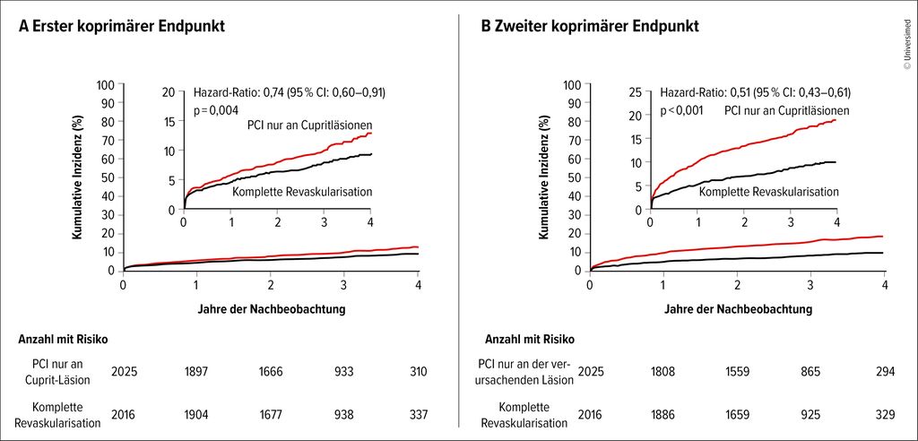 Die im New England Journal of Medicine publizierte COMPLETE-Studie untersuchte bei hämodynamisch stabilen Patient:innen mit STEMI und Mehrgefäßerkrankung den prognostischen Stellenwert einer kompletten Revaskularisation im Vergleich zu einer auf die Culpritläsionen beschränkten perkutanen Koronarintervention (PCI). Nach erfolgreicher PCI der Culpritläsion wurden Teilnehmende entweder in die Gruppe mit einer zusätzlichen PCI bei angiografisch signifikanten nichtinfarktbezogenen Läsionen oder mit keiner weiteren Revaskularisation randomisiert. Die Randomisierung erfolgte stratifiziert nach dem geplanten Zeitpunkt der PCI entweder während desselben Krankenhausaufenthalts oder in einer späteren Sitzung.