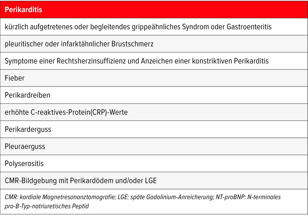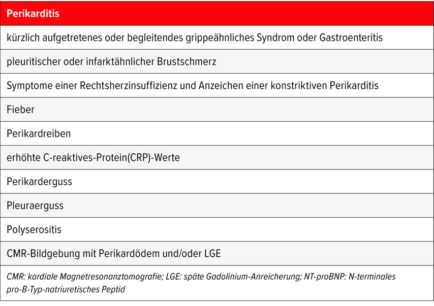 Tab. 3: Warnzeichen für die klinische Diagnose einer Perikarditis (modifiziert nach Schulz-Menger J et al. 2025)1
