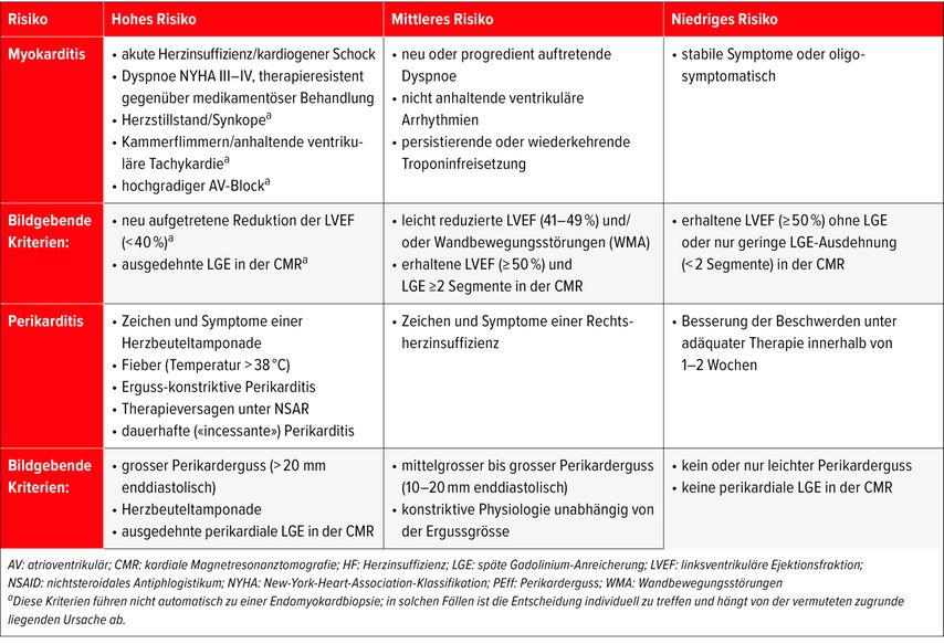 Tab. 2: Klinische Risikostratifizierung zur Steuerung der Diagnostik beim inflammatorischen Myoperikardsyndrom (IMPS), (modifiziert nach Schulz-Menger J et al. 2025)1