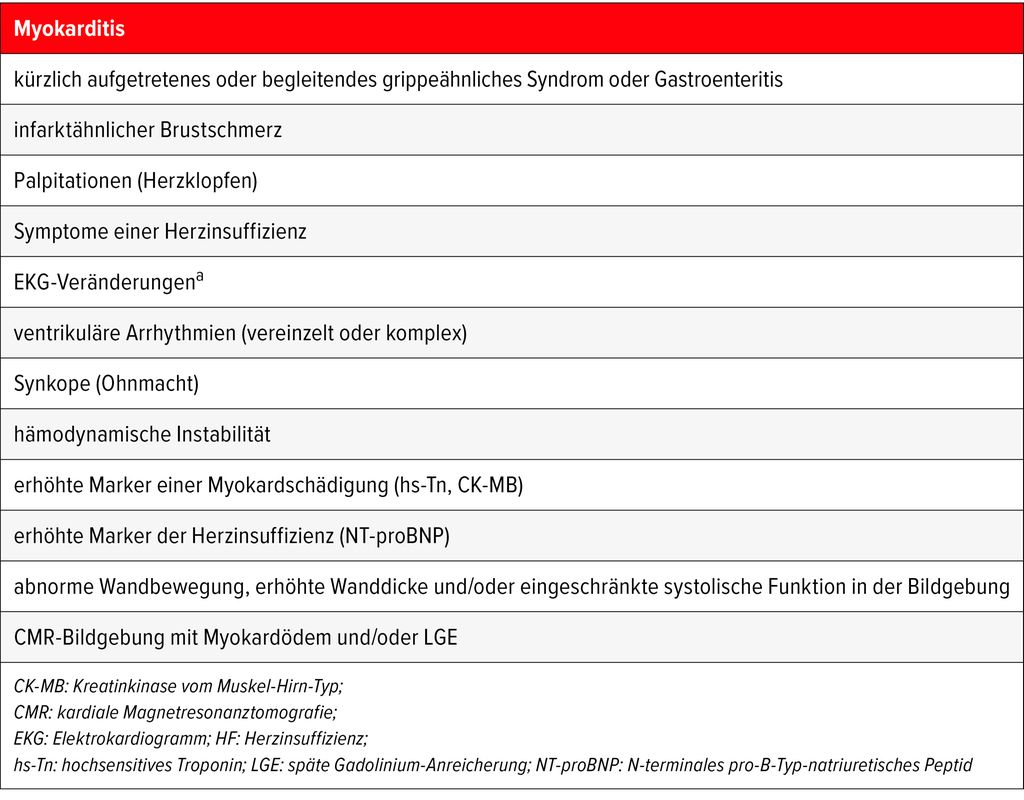 Tab. 1: Warnzeichen für die klinische Diagnose einer Myokarditis (modifiziert nach Schulz-Menger J et al. 2025)1