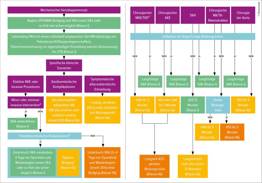 Abb. 2: Algorithmen zum empfohlenen antithrombotischen Vorgehen nach allen Typen von Herzklappeneingriffen. Links: ASS = Acetylsalicylsäure; INR = international normalized ratio; NKE = nichtkardiale Eingriffe; NMW = niedermolekulares Heparin; OP = Operation; UFH = unfraktioniertes Heparin; VKA = Vitamin K-Antagonist; ZTB = Zeit im therapeutischen Bereich; a = Haut- und kleinere augenärztliche Eingriffe (einschließlich Kataraktoperationen); Zahnreinigung, Behandlung von Karies und Zahnextraktionen; Implantation von Herzschrittmachern oder anderen kardialen Devices; sowie diagnostische Herzkatheteruntersuchungen. b = mechanische Herzklappen in Mitral- oder Trikuspidalklappenposition, ältere Generationen von mechanischen Herzklappen unabhängig von der Position, hereditäre oder erworbene Hyperkoagulabilität, LV-Dysfunktion (LVEF <35%), Vorhofflimmern bei signifikanter Mitralstenose oder ein schweres thrombotisches Ereignis innerhalb der letzten 12 Monate (z.B. kardioembolischer Insult, tiefe Venenthrombose, Lungenembolie). c = Bridging sollte begonnen werden, sobald der INR einen subtherapeutischen Wert erreicht, sowie am ersten postoperativen Tag bzw. sobald es als sicher erachtet wird. Rechts: AKE = Aortenklappenersatz; ASS = Acetylsalicylsäure; MK = Mitralklappe; MKE = Mitralklappenersatz; OAK = orale Antikoagulation; TK = Trikuspidalklappe; TKE = Trikuspidalklappenersatz; TAVI = Transkatheter-Aortenklappenimplantation; d = Für Transkatheter-MKE/TKE (z.B. Abbott Tendyne-MKE, Edwards Sapien M3-MKE; Medtronic Intrepid-MKE; Edwards Evoque-TKE) gibt es aktuell keine Richtlinien. Gemäß den Zulassungsstudien empfiehlt sich eine langfristige OAK sowie, insbesondere bei den TKE, auch ein Heparin-Bridging bei elektiven Eingriffen (übernommen und adaptiert, übersetzt aus Praz et al.: Eur Hear J 2025)2