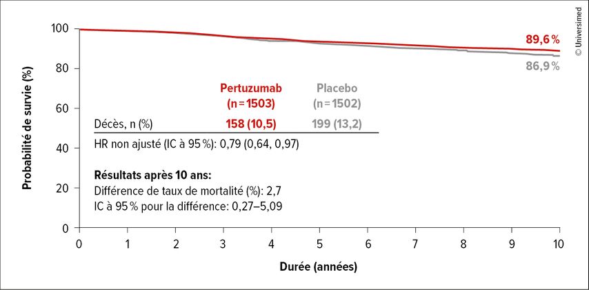 Selon l’analyse finale de la survie globale (OS), la double inhibition de HER2 a entraîné une réduction significative du taux de mortalité à 10 ans, avec une différence absolue de 1,8% (91,6 par rapport à 89,8%; HR: 0,83; p=0,0441).1