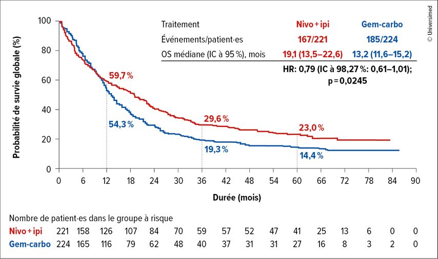 Dans l’étude de phaseIII randomisée ouverte CheckMate 901, le traitement par nivolumab plus ipilimumab (4 cycles) suivi de nivolumab en monothérapie (jusqu’à 24 mois) a été comparé à la gemcitabine plus cisplatine/carboplatine (6 cycles). Au total, 445 patient·es ont été inclus·es dans la cohorte des patient·es non éligibles au cisplatine. Les patient·es étaient âgé·es en moyenne de 70 à 71 ans, présentaient des métastases hépatiques dans 22 à 23% des cas et une expression de PD-L1 <1% dans 66% des tumeurs. Les critères d’évaluation primaires de l’étude étaient la survie globale (OS) de la cohorte des patient·es non éligibles au cisplatine et des patient·es présentant une expression de PD-L1 ≥1%.